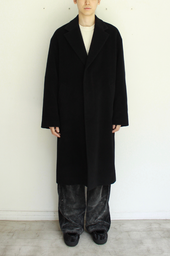 クローゼットに眠る、父や祖父のクラシックなチェスターコートを着想源にオーバーサイズのシルエットで、肩パットなどを使用せず、素材を最大限生かしたソフトな仕上がりとなっています。使用したシングルメルトンは90'sのデッドストック素材でアンゴラ・カシミアが高混率で入っており、上品な光沢感と柔らかく、肌触りの良い風合いが特徴な上質な素材です。