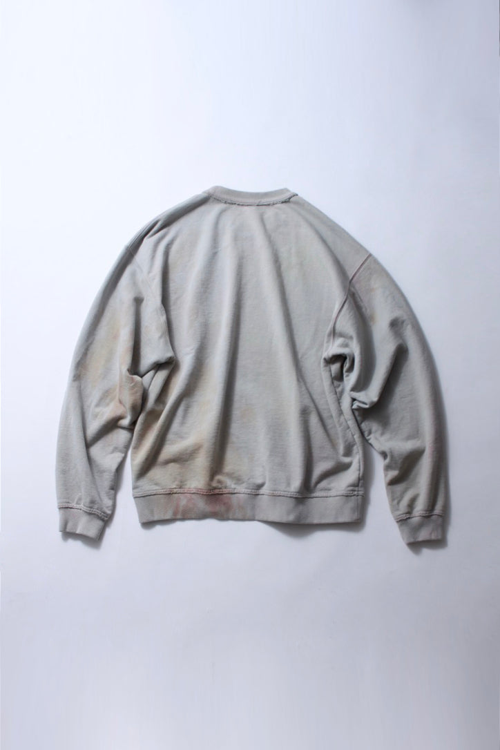 トルコ産オーガニックコットンの裏毛を使用したスウェットシャツです。裁ち切りで付けられた衿や袖口、裾のリブ付けは特徴的なディテールです。全体をアイスグレーに製品染めし、その後色移りしたかの様な、移染加工を施すことで、1点ずつ異なる表情のピンクが入ったスウェットは今までにない新たな表情を作り上げています。