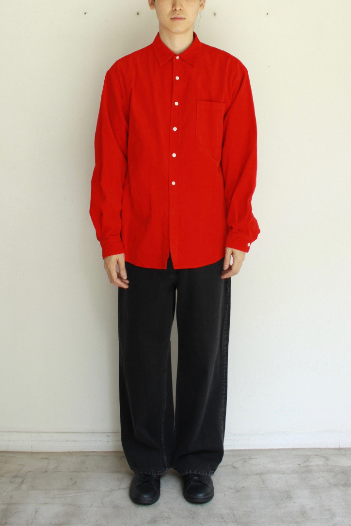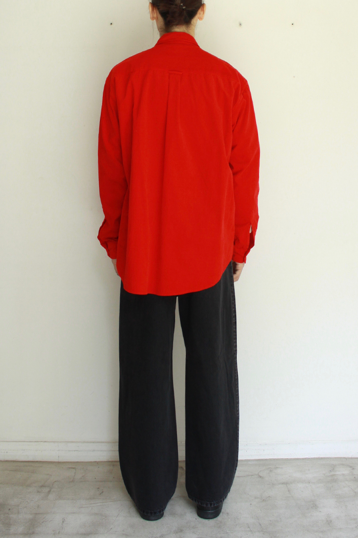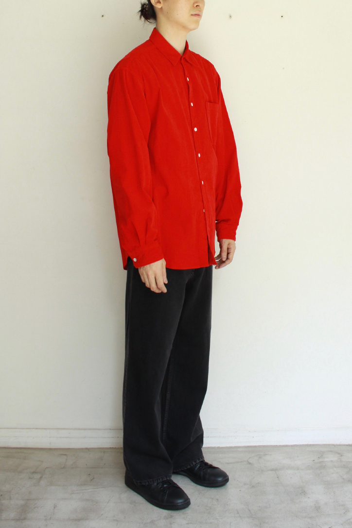 ゆったりとしたボックスシルエットのレギュラーシャツです。細畝のコーデュロイ素材にリップル加工を施し、横や斜めに入るランダムなシワ感、凹凸のある表面が印象的です。製品染めを行なったREDカラーはヴィンテージシャツの様なこなれ感とコーデュロイの程よい肉感を持ち合わせたシャツです。